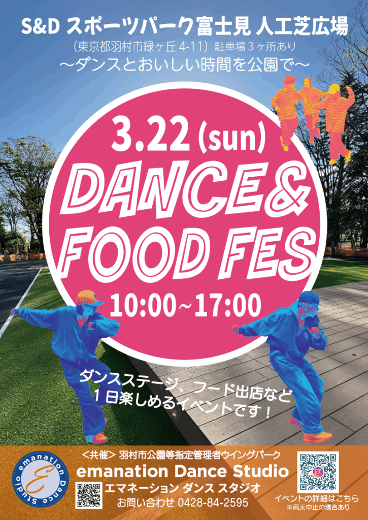◆ダンスは10:30~16:00の間でいくつかのグループに分かれて行う予定です。emanation Dance Studio河辺校emanation Dance Studio羽村校ウィングパークキッズダンス教室上記3校より出演!