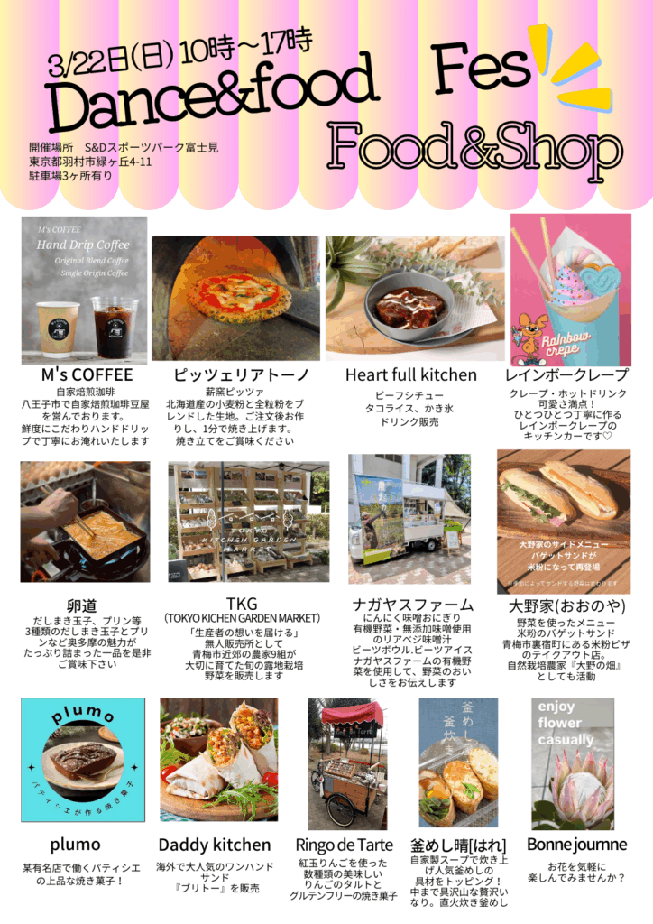 こんな思いからダンスだけでなく、地元でご活躍のキッチンカーの皆さん、押しのキッチンカーさんたちにご協力をいただき、1日公園で楽しめるイベントを初開催いたします。